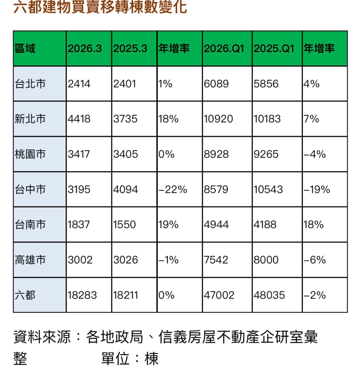 統計顯示,六都3月建物買賣移轉棟數1.8萬棟,較去年同期持平,第一季六都的建物買賣移轉棟數4.7萬棟,年微減2%,整體表現以雙北較為穩定,台北市第一季移轉棟數6089棟年增4%,新北市1.1萬棟年增7%,桃園則是8928棟年減4%,台中市明顯降溫第一季建物買賣移轉棟數8579棟年減19%,台南市4944棟年增18%,高雄市7542棟年減6%。