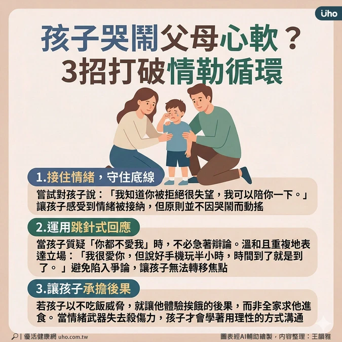 「別人的爸媽都會答應,你最壞了!」「你不愛我,我不要吃飯了!」這類台詞對許多父母而言並不陌生。在家庭日常中,孩子常因要求未獲滿足,轉而使用哭鬧、冷戰或言語威脅,試圖達到目的,讓家長產生「我是壞父母」的罪惡感。