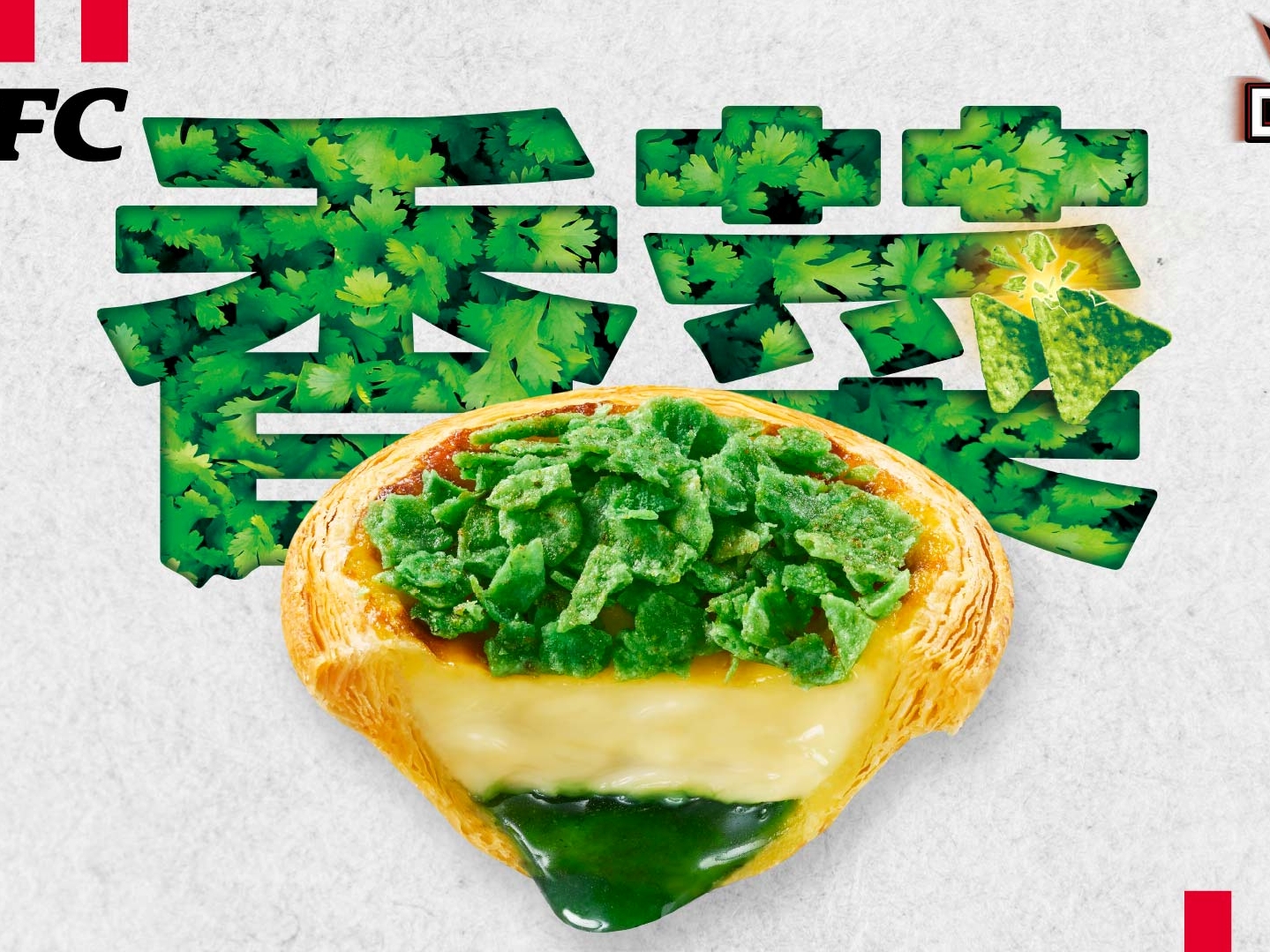 肯德基「香菜爆擊蛋撻」於2026年愚人節檔期限量限時開賣,表面鋪上香菜口味多力多滋玉米脆片,內餡加入特製流心香菜風味醬,打造甜與鹹交錯的口味。(圖片來源:肯德基提供)