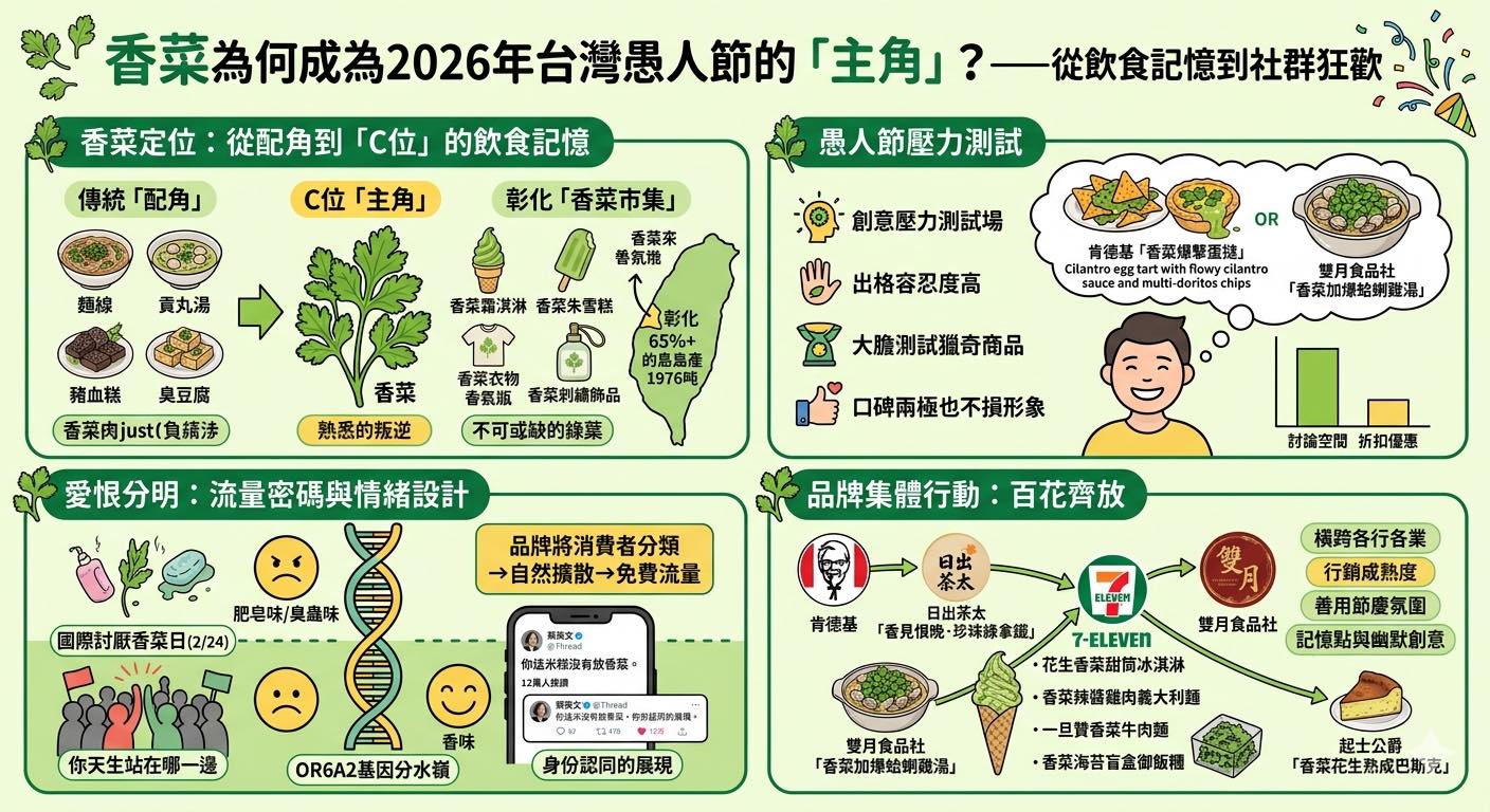 2026年愚人節的「香菜大亂鬥」,也說是台灣飲食文化獨特魅力的最佳見證,品牌用幽默和創意,讓消費者心甘情願為品牌買單。通常這一天,消費者對「獵奇」的容忍度較高,在台灣,人們習慣使用新鮮的香菜(芫荽)葉片為湯菜調味、增色添香,從街頭小吃的麵線、貢丸湯、豬血糕、臭豆腐,到近年流行的火鍋、披薩,都能看見香菜的蹤影,本土香菜在彰化縣和雲林縣是重要生產基地。