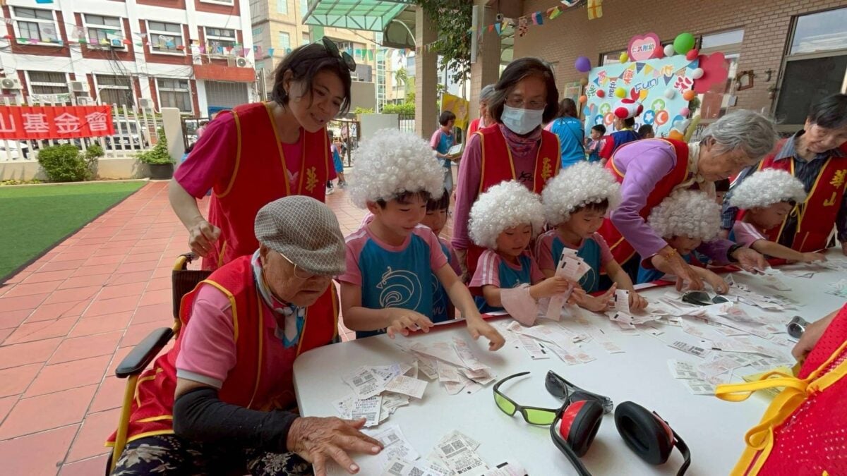 其中,獨居76歲的李阿嬤早年喪子、長期缺乏關懷,華山自民國102年起持續陪伴,得知她喜愛孩子,特安排參與此次活動。活動由仁武國小附設幼兒園小朋友熱舞揭開序幕,接著由李阿嬤擔任關主,陪伴孩子進行老化體驗,讓孩子從中理解長者不便,也在互動中建立尊重與同理。李阿嬤還跟戴上假髮、墨鏡、耳罩的小朋友比賽數發票,阿嬤輕鬆得得第一名,她開心的說:「好久沒有跟這麼多小朋友互動,真的玩得很開心。」