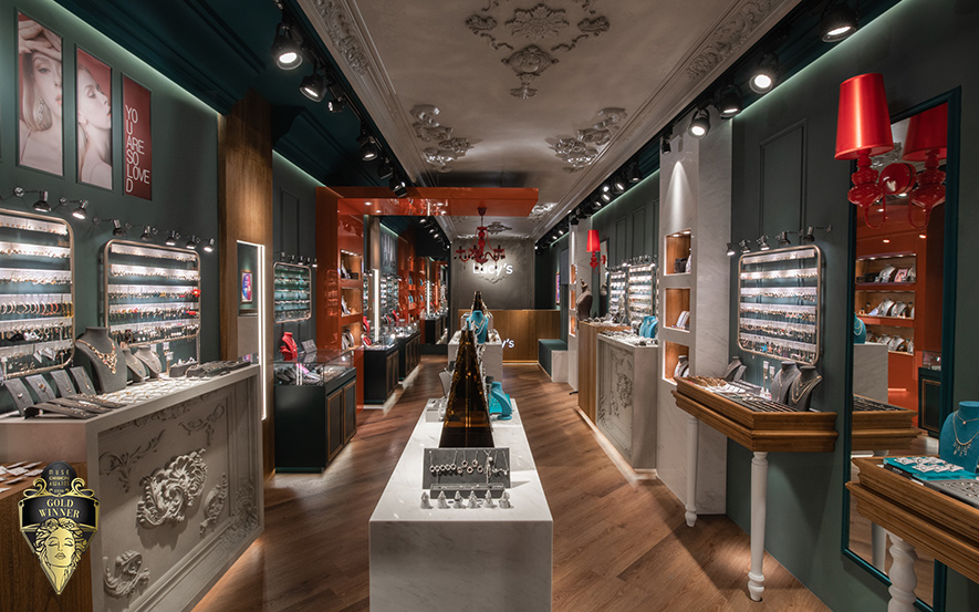 ▲騎樓天花板設計古典雕花與水晶吊燈,將優雅氛圍延伸至商圈街道,成為日夜閃耀的視覺焦點,引導顧客從日常步入精緻情境;櫥窗以大面透明玻璃呈現多種飾品的佩戴效果,加上色彩對比與品牌logo,讓路人感受「精品卻親民」的第一印象,激發進入店內的好奇心與停留意願。