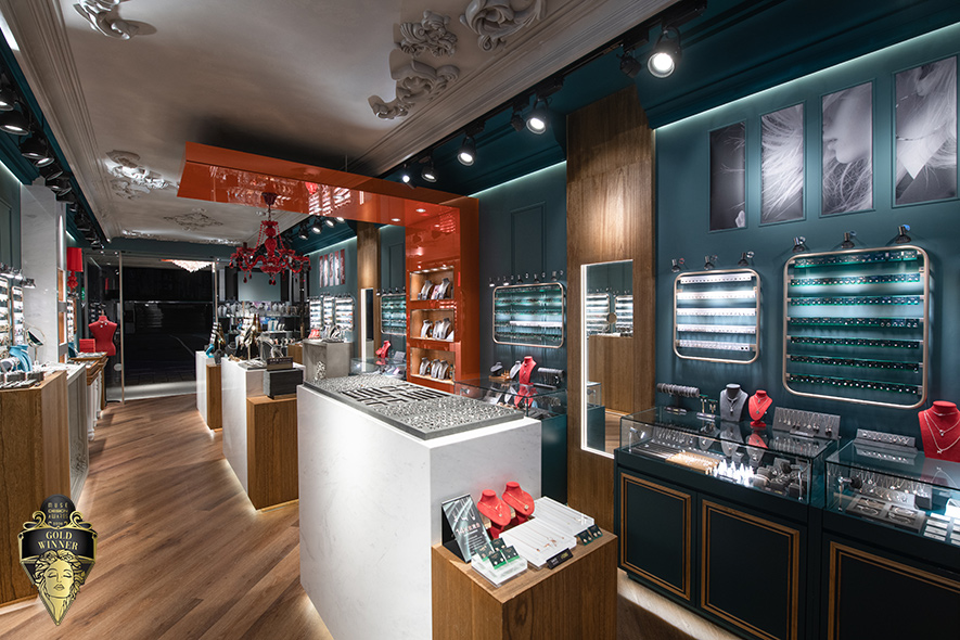 Corridor》,以雕花線板、水晶吊燈及高光澤烤漆櫃體營造劇場般的儀式感,並透過中島串聯展示牆的迴圈動線,搭配鏡面及試戴檯的巧妙穿插,讓顧客在坪數有限的狹長店面中循序沉浸於品牌故事,更將購物體驗自然延伸至社群互動、傳播。其在盡展豐富視覺張力之外更兼顧商業實效,精準回應賽事對設計創新與場域整合的高標準,榮獲「金獎」殊榮!