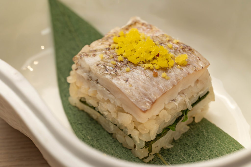 ▲ 西村料理長出身京都,在料理中延續了關西和食精神,此道「春日鯛箱壽司」便是最佳詮釋。(圖:高雄日航酒店)