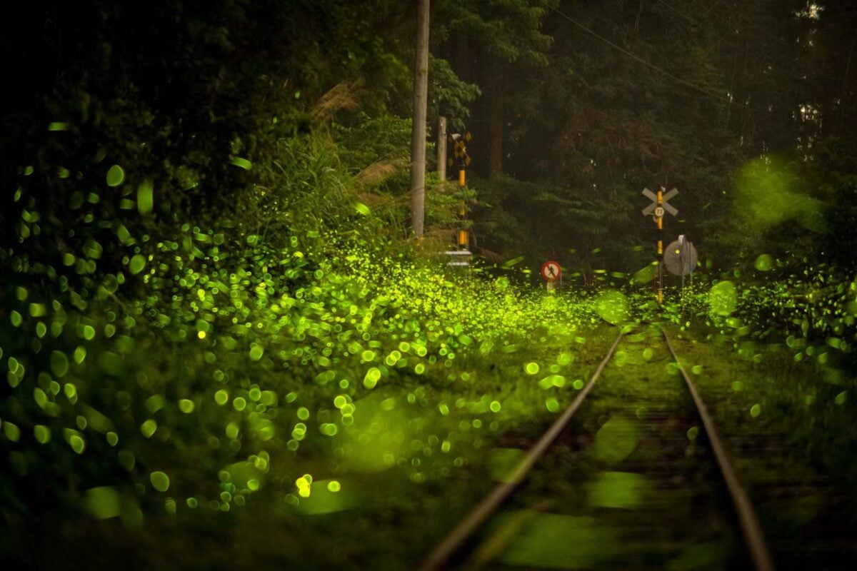 隨著夜幕低垂,瑞里的浪漫氛圍轉為螢光綠,位於阿里山林鐵交力坪與奮起湖之間的小站「水社寮車站」,因當地長期推廣低碳環境,意外保存最原始的生態棲地,每到螢火蟲季節,成千上萬的螢光在廢棄校園與鐵道邊閃爍,宛如鋪上一層「螢河地毯」,漫天飛舞的螢光美不勝收。