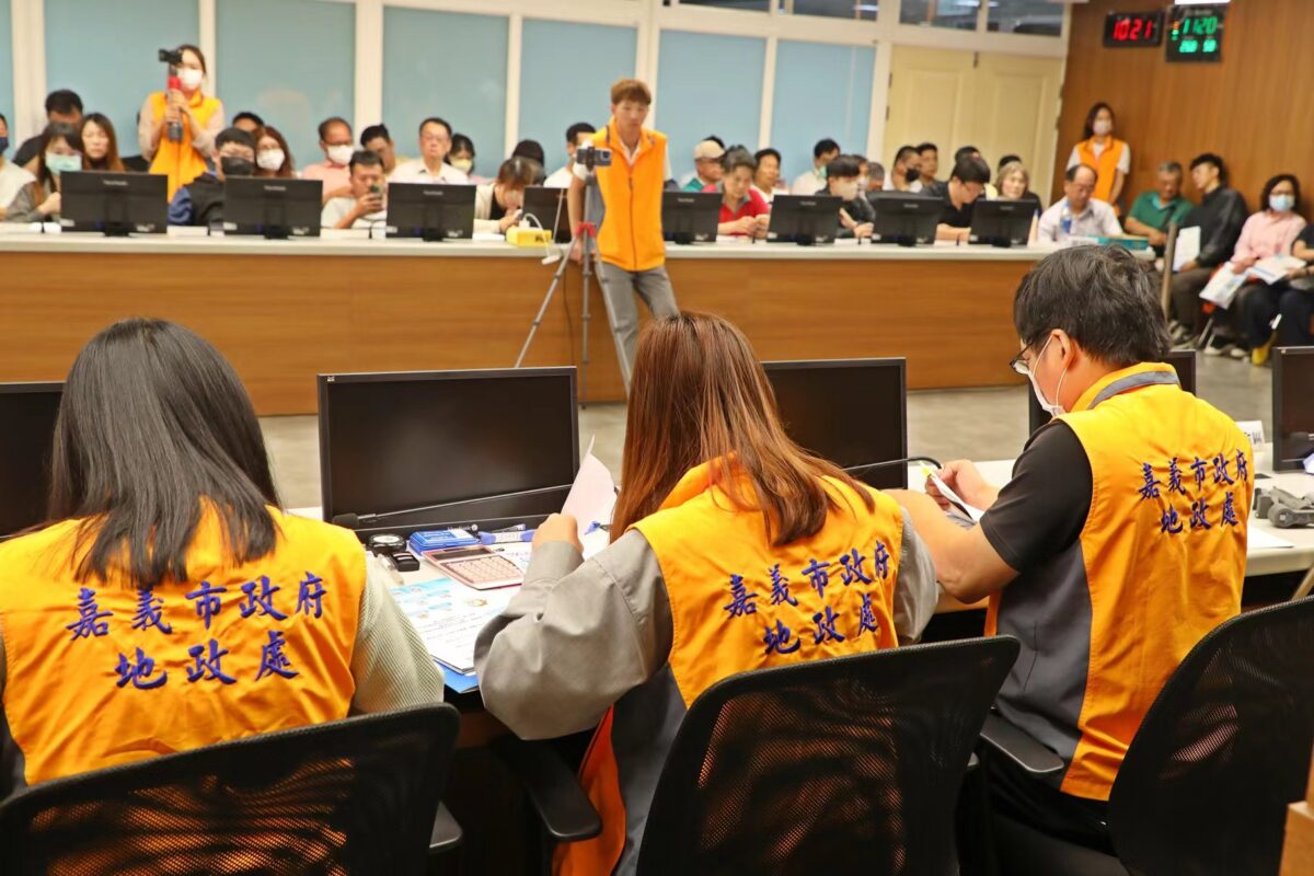 圖:嘉義市政府今(2)日辦理建國二村、復興新村地區市地重劃抵費地開標作業,推出3標7筆土地,全數順利標脫,標脫率達100%,得標總金額約13.99億元,平均溢價率約61%。(記者吳瑞興翻攝)