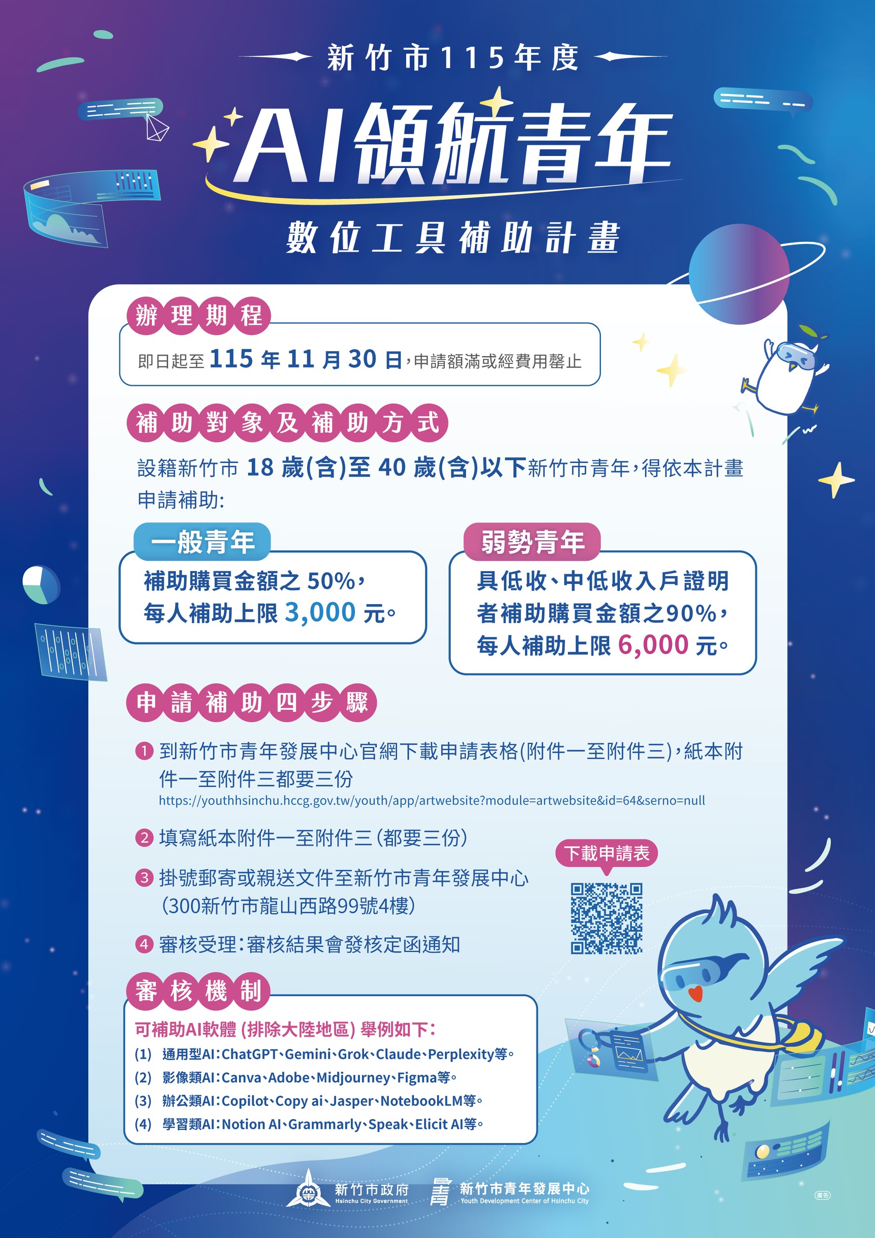 青發中心主任陳毅璇說明,此次「AI領航青年數位工具補助計畫」涵蓋通用型、影像類、辦公類及學習類等多元工具,歡迎符合資格的青年踴躍申請。相關資訊及申請文件請至新竹市青年發展中心官網查詢( https://youthhsinchu.hccg.gov.tw/youth/app/artwebsite?module=artwebsite&id=64&serno=null )。