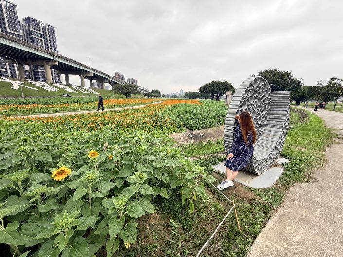 黃裕斌指出,走入花海區域,民眾可近距離欣賞各式花卉姿態,隨著微風輕拂,花浪起伏,形成動態景致。現場不僅可見蜜蜂忙碌採蜜,亦常見蝴蝶穿梭飛舞,為花田增添生氣與靈動感。這樣的生態互動也顯示河濱環境逐步優化,讓都市中仍能保有自然生機,提供民眾兼具休閒與環境教育的空間。