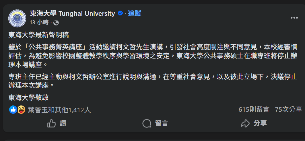 東海大學是在昨下午發布聲明稿指稱,公共事務碩士在職專班「公共事務菁英講座」的邀請作業,數月前已完成規劃與安排。當時相關司法判決尚未出爐,基於既有時程與學術規劃邀請,並無任何政治考量。大學的角色,在於提供多元觀點,而非單一立場傳遞。不料卻又在晚間再度發聲明稿表示,鑒於「公共事務菁英講座」邀請柯文哲演講,引發社會高度關注與不同意見,經審慎評估,為避免影響校園整體教學秩序與學習環境安定,將停辦講座,因為引發爭議。