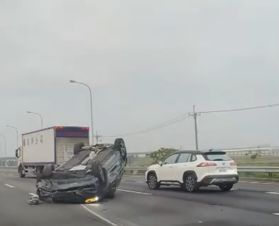 國道1號自小客車遭兩車撞擊翻覆。翻攝畫面