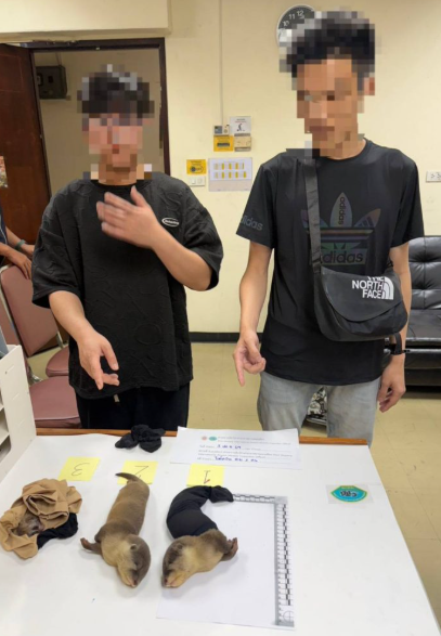 警方接著對在機場大廳等待訊號的另1人進行搜查,發現其將2隻小爪水獺與1隻懶猴裝入絲襪中,藏於褲子前方口袋內,企圖躲避檢查攜帶出境。目前兩名嫌犯已被移送至相關調查單位,後續將依法進行偵辦與處理。