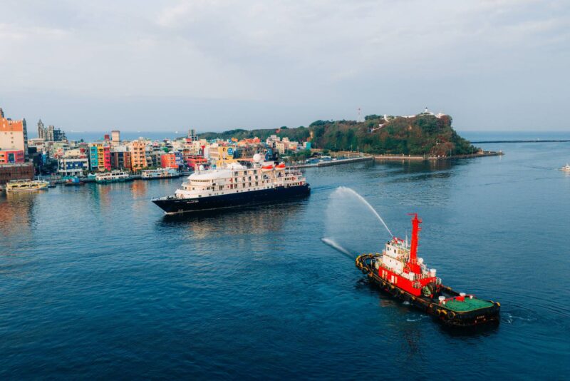 高雄港3月8日甫迎接歷年最大郵輪—地中海郵輪「地中海榮耀」(MSC BELLISSIMA)後,本(4)月5日上午則迎來截然不同的小型郵輪—卡莉多麗(Noble Caledonia)之「島嶼天空」(ISLAND SKY)首度靠泊高雄港,成為今年第6艘首航高雄港的國際郵輪,高雄港務分公司特別以象徵歡迎的噴水儀式隆重迎接郵輪進港,並致贈船長首航紀念牌,表達誠摯歡迎之意。