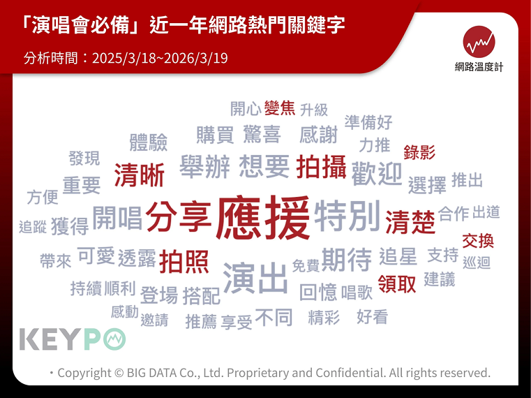 《網路溫度計DailyView》透過輿情分析軟體《KEYPO大數據關鍵引擎》,來看「演唱會必備」近一年(2025/3/18~2026/3/17)網路熱門關鍵字,可見「應援、分享、交換、拍照、拍攝、錄影、變焦」等字詞。