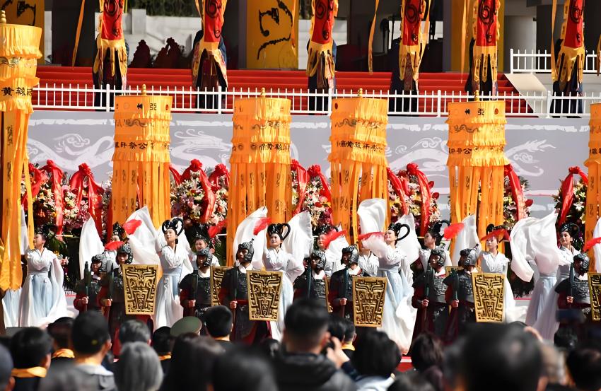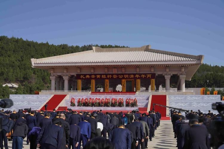 2026年清明公祭軒轅黃帝典禮5日上午在陝西省延安市黃陵縣橋山祭祀廣場舉行,上午9時50分,公祭典禮正式開始,擊鼓鳴鐘後,《黃帝頌》響徹全場,各界代表依次敬獻花籃,恭讀祭文,隨後全體人員向軒轅黃帝像行三鞠躬禮,接著是氣勢恢宏的告祭樂舞,然後56公尺長中華龍騰空升躍,將現場氛圍推向高潮。