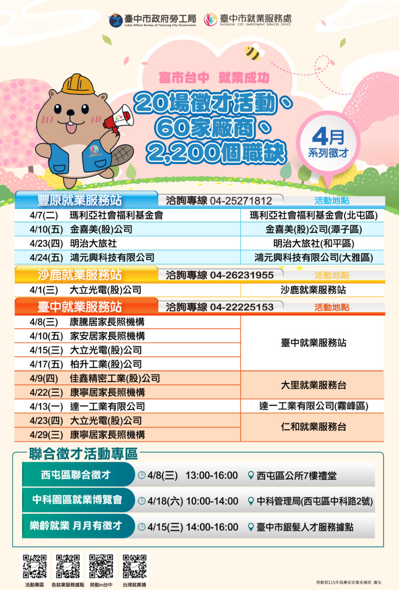 【記者 廖美雅/台中 報導】台中市政府勞工局4月起推出「求職應援季」,整合徵才活動、暑期工讀、職涯升級及名人講座等服務,全面協助市民及青年朋友銜接職場。首波登場為「富市台中 就業成功」4月系列徵才活動,邀集台積電、矽品精密、綠茵生技及香繼光等60家廠商,辦理20場徵才活動,提供超過2,200個優質職缺。