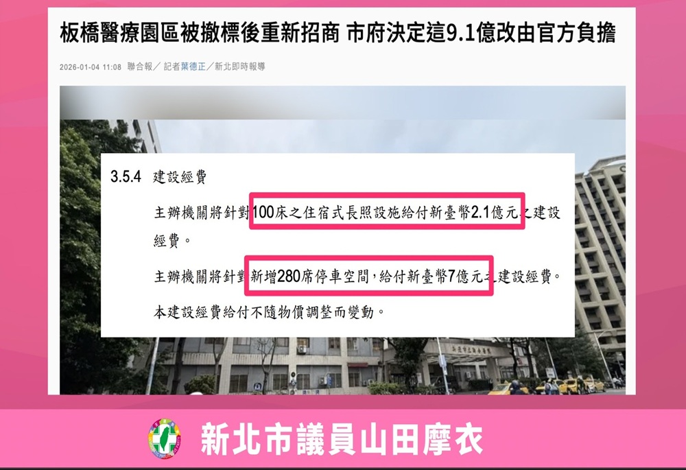 新北市板橋醫療園區BOT案日前截止第二次招商公告。市議員山田摩衣近日在議會中質詢表示,市府為提高投標意願,編列高達9.1億元補助,其中7億元用於興建停車場,卻未設收益回饋機制,未來停車費可能由廠商全數收取,質疑公帑補貼卻未兼顧公平。新北市衛生局長陳潤秋則回應,相關資產仍屬市府,並非完全讓利給業者所有。