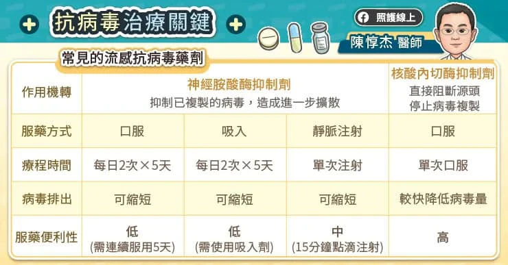 目前常見抗流感病毒藥物包括需連續5天服用的口服藥物,以及單次靜脈注射劑型。近來亦出現新型單次口服抗流感病毒藥物,使用更為便利,只需服用一次即可完成治療。臨床經驗顯示,此類單次口服藥物在改善與緩解流感症狀方面,效果與傳統療程相當,且可較快降低體內病毒量,有助控制傳播風險,也提供患者更多元的治療選擇。