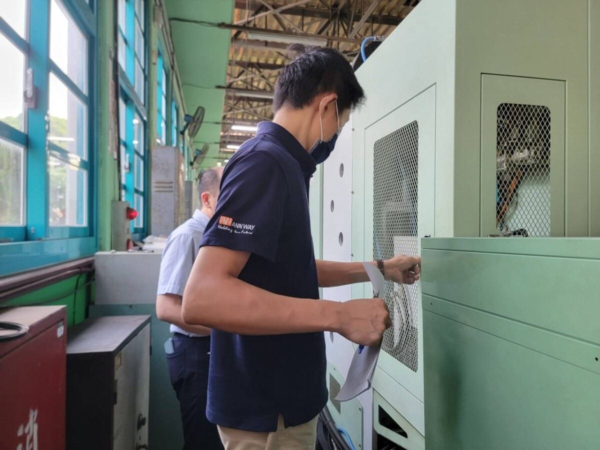 ▲中彰投分署訓練師正在盤查訓練場域工具機附掛冷卻機。