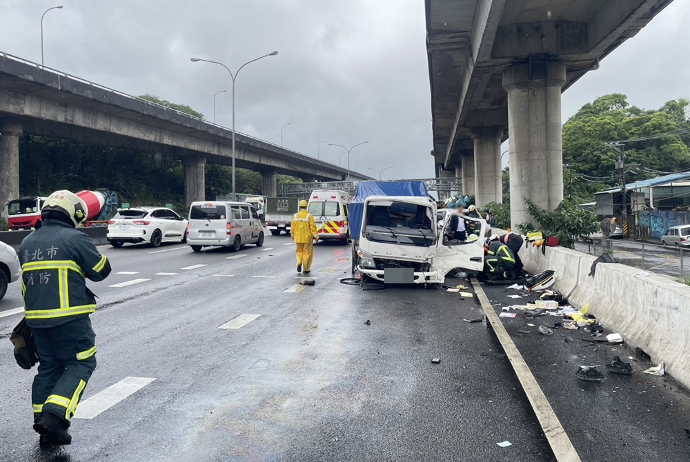 國道警方表示,63歲許姓男子駕駛小貨車,行駛於國道1號北向15.4公里內湖路段輔助車道,疑因不明原因向左撞擊行駛於外線車道,33歲鄭姓男子駕駛的預拌混擬土車,兩車失控後再往前撞擊前方4輛小客車。許姓駕駛當場失去意識,警消送往內湖三軍總醫院急救,於今天下午4時左右,宣告急救無效死亡。其餘各車共4人輕傷,送台北市立聯合醫院忠孝院區,各車駕駛酒測值待測,詳細的肇事原因,則有待警方進一步釐清。
