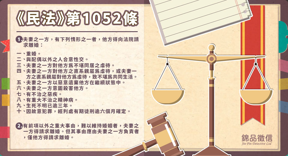 依據我國《民法》第1052條規定,重婚、與配偶以外之人合意性交、不堪同居之虐待、惡意遺棄等情形,皆屬法院可准予離婚的事由。同時,條例亦規範,若有其他重大事由導致婚姻難以維持,也可請求離婚,但須釐清責任歸屬。