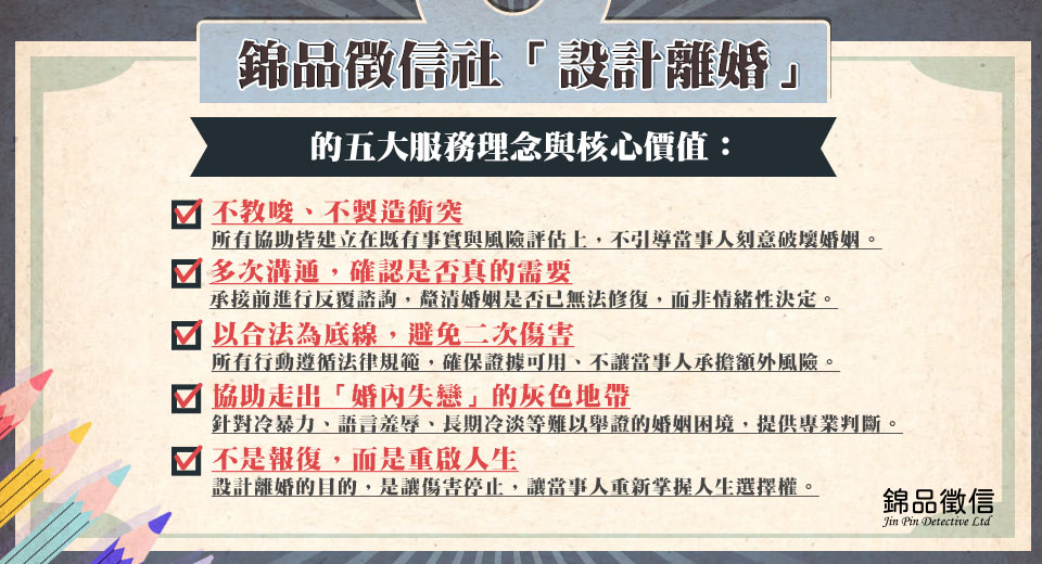 「並不是每一段不幸福的婚姻,都適合走到設計離婚這一步。」錦品徵信社再次強調,專業的價值在於幫助當事人釐清選擇,而非刺激情緒、替代他們下決定。