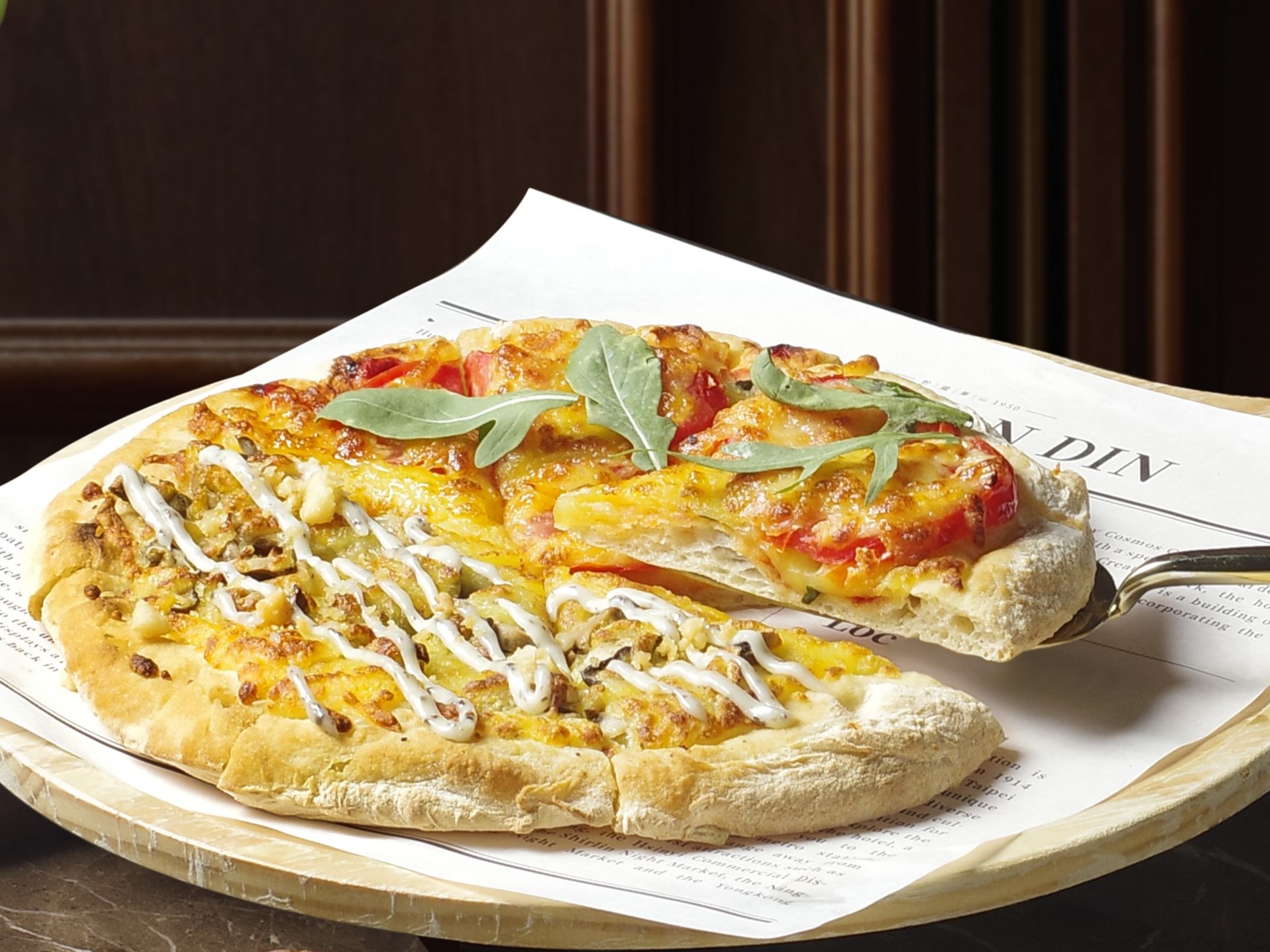 接著必吃雙拼披薩,經典瑪格莉特、蜂蜜松露野菇或鹹豬肉口味通通有,鹹香濃郁又帶層次,一口接一口停不下來。還有「炸雞凱薩沙拉」,酥脆炸雞配濃郁醬汁,罪惡但超滿足。