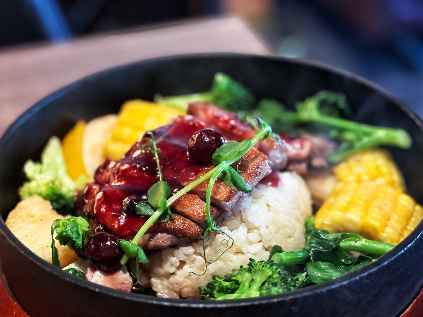 主食部分更是誇張,「炙燒櫻桃鴨胸飯」肉質嫩到不行,「大力金剛腿」整個霸氣上桌,外酥內嫩超有存在感。最後壓軸「炙燒鮭魚火山卷」,翻轉瞬間直接變拍照焦點,好吃又好玩,完全就是聚餐必點王。