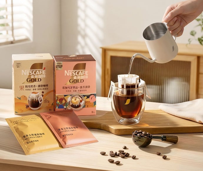 雀巢金牌濾掛咖啡新品已於全聯、家樂福、大全聯、愛買、momo購物網及蝦皮等各大通路全新上市。全聯即日起至5月7日更有「單品耶加雪菲」買1送1(一盒8入,原價220元)、「陽光橙香」2盒199元(一盒8入,原價125元)的優惠。同時,momo購物網更獨家推出「雀巢金牌綜合濾掛咖啡綜合組」禮盒,從中淺焙果香與花香調到深焙的堅果焦糖調等四大風味一次帶走,用質感手沖風味陪伴你我每個日常片刻,送禮自用兩相宜。