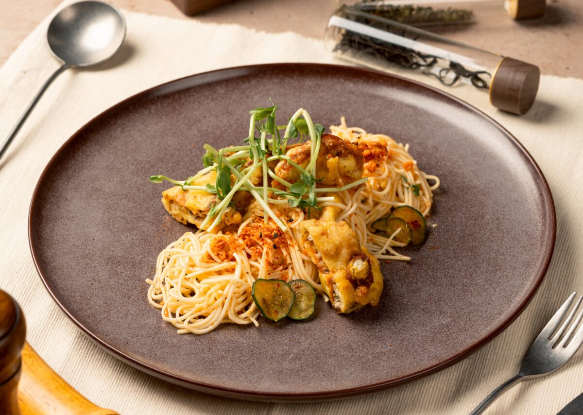 ▲主餐之一「金沙軟殼蟹麵」,以鹹香濃郁與複合辛香的味型特色,展現中式菜色風味多樣性。