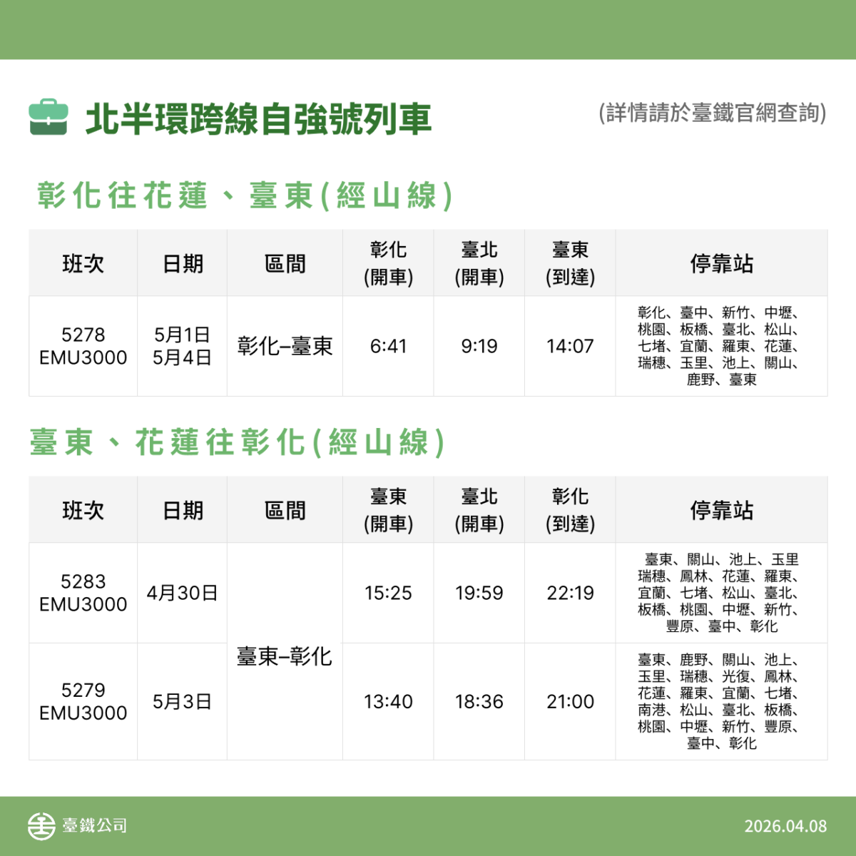 【記者 劉蘇梅/台北 報導】臺鐵公司因應115年勞動節疏運旅客需要,自115年4月30日(星期四)起至5月4日(星期一)止計5天,全線加開各級列車共計108列次(西線44列次、東線64列次)。其中包含北半環跨線自強號列車4列次、南半環跨線自強號列車6列次、西部幹線自強號列車16列次。另為加強疏運旅客,自4月30日至5月4日止暫停發售親子車廂車票,改以一般車廂方式售票。