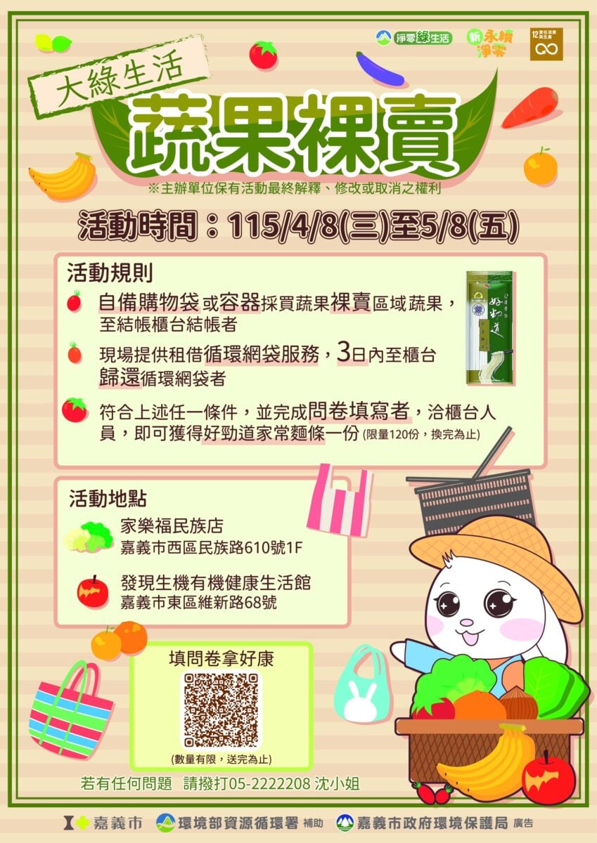 嘉義市政府環境保護局表示,所謂「蔬果裸賣」,係指蔬菜、水果不再以塑膠袋、塑膠盒或保鮮膜等一次性包材進行預先包裝,而改以散裝方式陳列販售,讓民眾可依需求自由選購,減少不必要的包裝使用。該局即日起至5月8日,在家樂福民族店及發現生機有機健康生活館等2家超市辦理「蔬果裸賣不穿衣,自袋環保Easy Go」推廣活動,鼓勵消費者從日常採買實踐減塑行動。