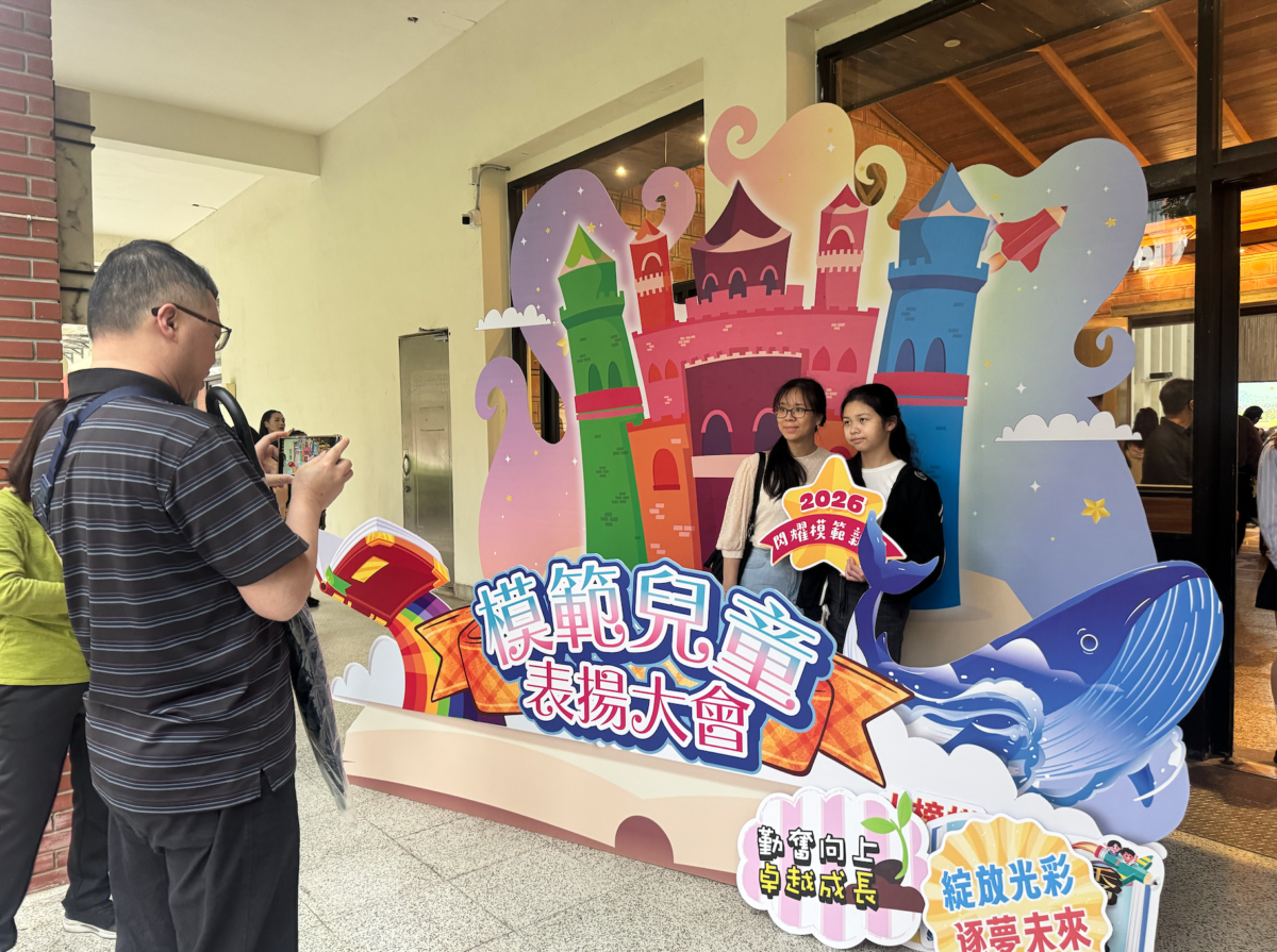 ▲縣府表揚模範兒童並發放禮券,現場設置精美背板供學童合照留念。