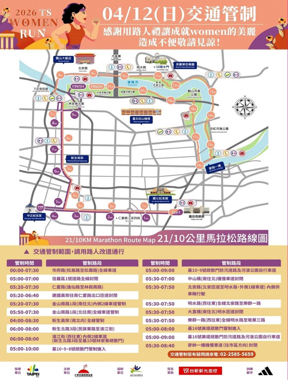 【民眾網編輯方笙楠臺北報導】中華民國路跑協會訂於115年4月12日(星期日) 5時至10時,假本市市民廣場及大佳河濱公園舉行「2026 TS WOMEN RUN」路跑活動,為維護交通秩序與活動安全。