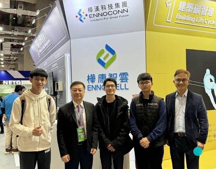 ▲劉毅安(左一)在大學階段就進入「樺漢科技集團AI應用發展部門」擔任實習生。朱復銓董事長(左二)親自帶領菁英班學生瞭解最新智慧製造與雲端應用技術。