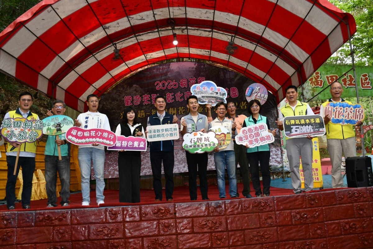 【記者 廖美雅/彰化 報導】油桐花季來臨,由彰化市公所、彰化市福田社區發展協會共同舉辦的「2026桐花祭~福田桐花小旅行」活動,自4月18日至5月3日登場,有:生態園區賞桐步道之健行、社區小農市集、團體DIY活動及街頭藝人表演活動等,市公所今(9)日在福田賞桐生態園區舉行活動記者會,主秘許晉嘉指出彰化市福田每年4、5月間盛開的桐花,由於主要分布在山谷中,因此特別艷麗且較不會受破壞;福田社區發展協會理事長張慶富則強調,今年雖受氣候影響,桐花花期較晚,最美花況約將落在4月底左右,盛開花況可期!