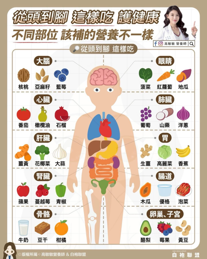 ▲ 從頭到腳的健康飲食指南!營養師曝「9大食物」對應身體部位 讓你吃得健康。(圖:高敏敏營養師 & 白袍聯盟)