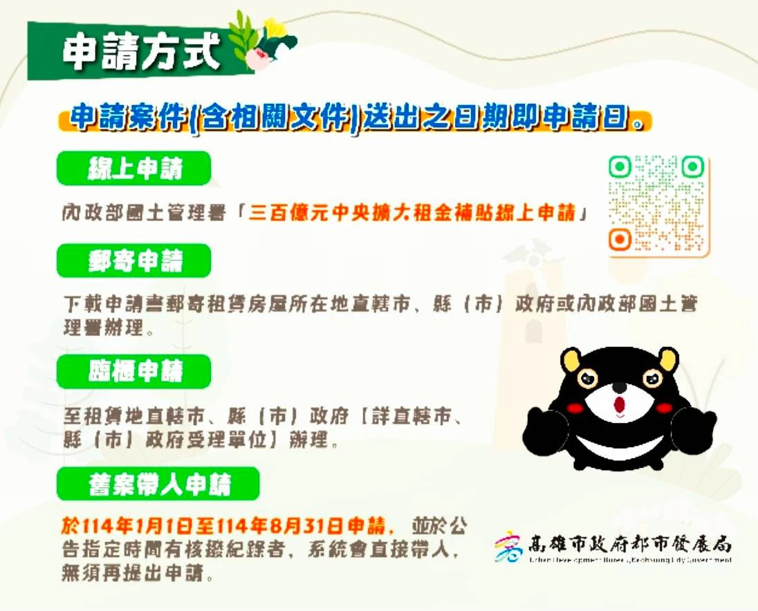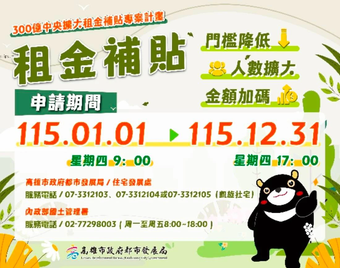 高市府都發局局長吳文彥表示,300億中央擴大租金補貼專案從2023年7月3日開辦以來,由於資格放寬及加碼補貼,統計2025年1高雄市就有12萬餘戶提出申請。該專案採隨到隨辦方式辦理,今年度一路開辦至2026年12月31日下午5時止,只要申請且符合資格者,將全部滿足,沒有戶數之限制,以減輕租屋負擔,且舊戶民眾不用擔心,將直接帶入審查不用重新申請,惟租約如已到期仍需提供新租約予地方政府辦理審查,以免影響後續撥款。