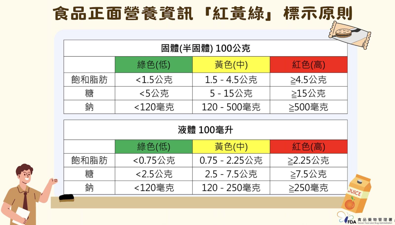 食藥署與國健署下午正式公布這項食品正面營養資訊「紅黃綠」標示制度的指引草案,指引中以每100公克(固體)或每100毫升(液體)為標示基準,針對糖、鈉及飽和脂肪三項營養素,採「紅黃綠」三色分級標示。