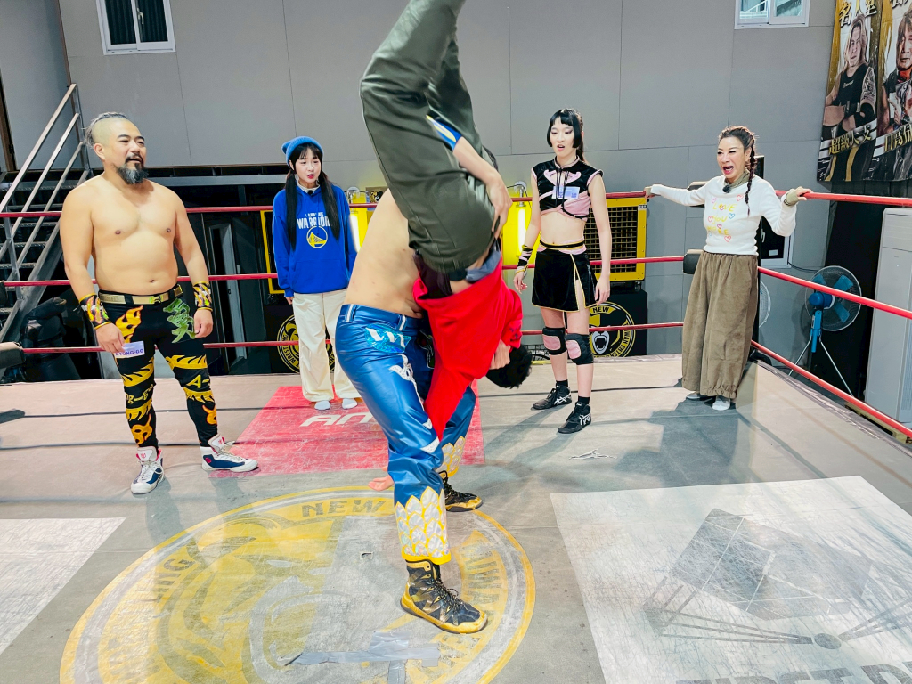 接著在職人的演繹下,眾人先後看了各種必殺技,也學習基本的打擊技巧,以及翻摔技巧,將人高舉過頭再摔下,可以讓大家體驗「輕輕放下」的版本。阿翔、楊浩威貝高舉時都露出驚訝神色,直呼也太有力氣了,職人先從楊皓崴開始,用手劈打他胸腔,讓他痛到直接蹲下,接下來的「駱駝固定技」示範,楊繡惠讓阿翔跪蹲下,她從後面勒住巴子往後掰,讓阿翔疼的哇哇叫。