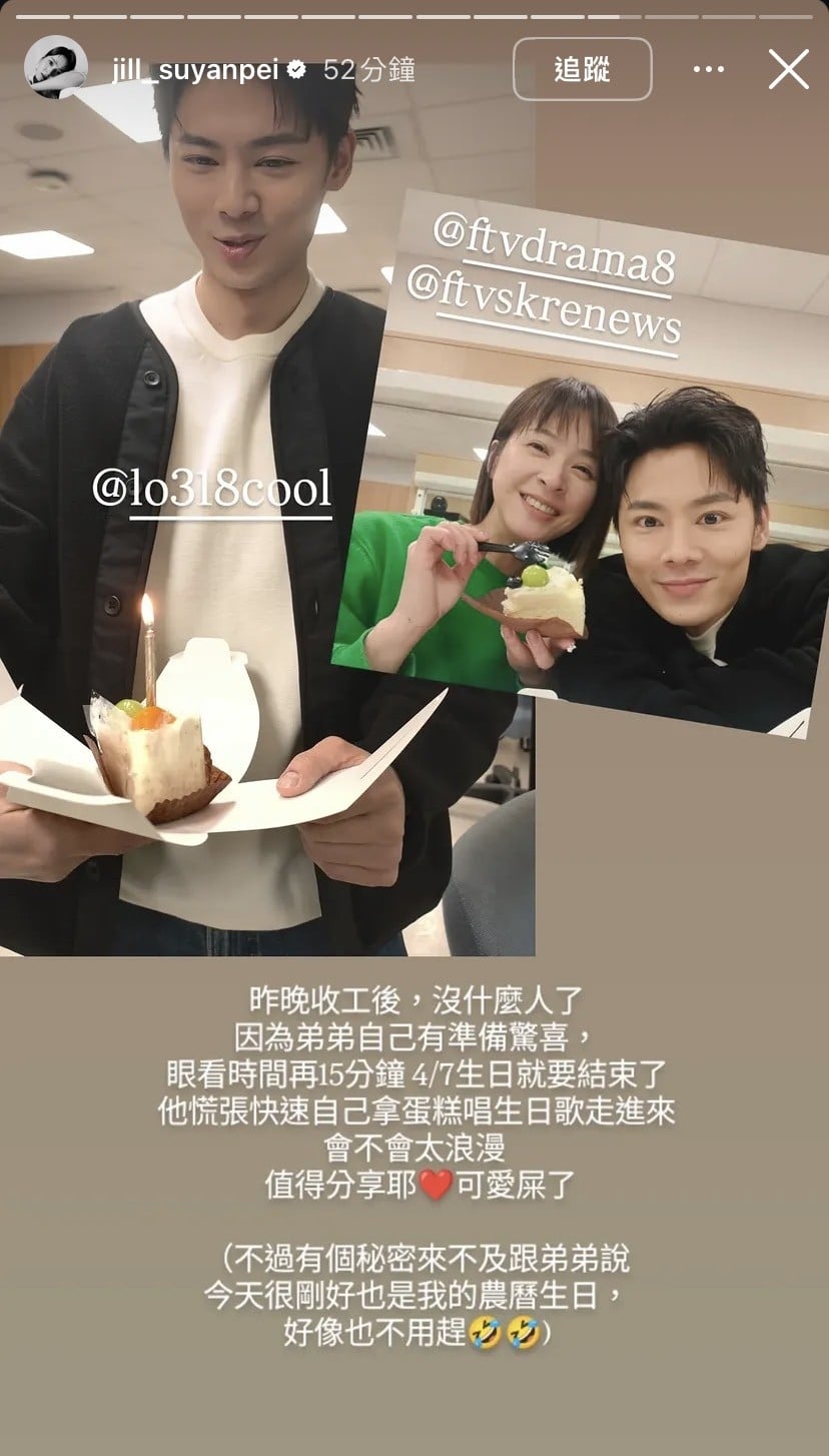 沒想到戲外兩人的互動比劇本還精采,蘇晏霈在社群平台透露,昨晚收工後,演員休息室已人煙稀少,羅子惟竟悄悄準備了「驚喜」。眼看距離生日結束只剩最後15分鐘,羅子惟一邊慌張地端著蛋糕、一邊快步踏進休息室大唱生日快樂歌,這份「壓線」的真心讓蘇晏霈既驚訝又感動,忍不住發文直呼:「會不會太浪漫!」更不忘大讚羅子惟趕時間的模樣「好可愛」,認為這份心意一定要跟粉絲分享。