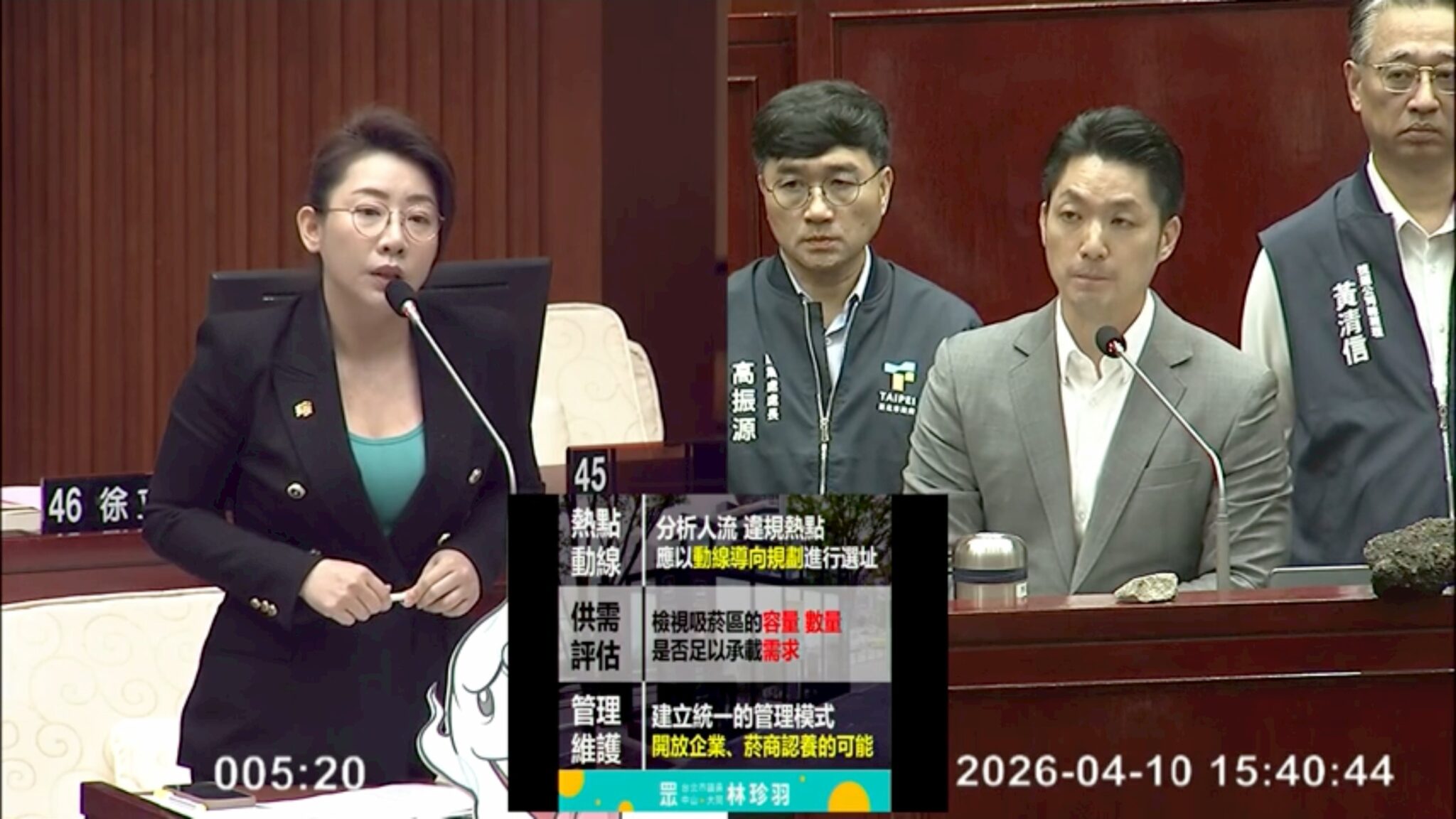 【民眾網編輯方笙楠臺北報導】臺北市議員林珍羽4月10日於議會市長蔣萬安施政報告質詢無菸城市政策時直指關鍵,目前北市「有禁菸區、有吸菸亭,但違規仍滿街」,政策恐淪為「做半套」,要求市府正視執行力與整體規劃問題。