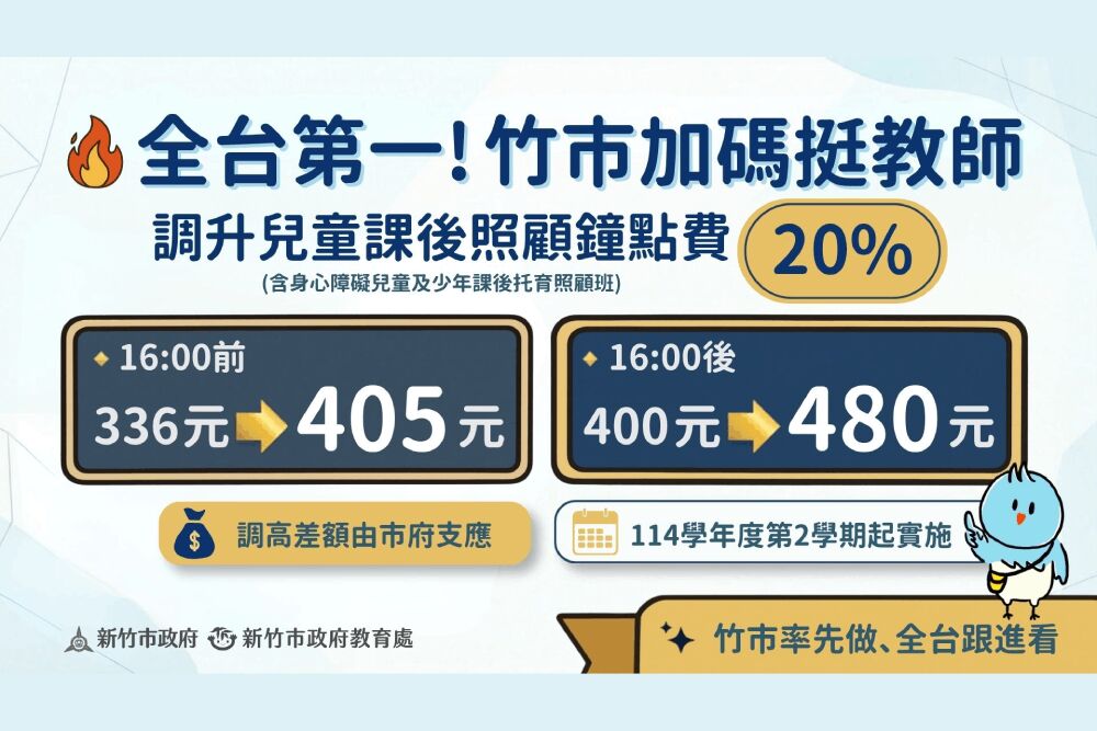 近年各校普遍面臨兒童課後照顧師資招募困難問題,教育處表示,此次調整有助提升教師投入意願,穩定教學人力,進而強化整體服務品質。兒童課後照顧服務不僅是教育政策,更是支持雙薪家庭的重要後盾。未來市府將持續精進教師支持措施與教育資源投入,打造「新竹好學、幸福成長」的優質教育環境,讓孩子安心學習、家長放心托付、教師專心教學。