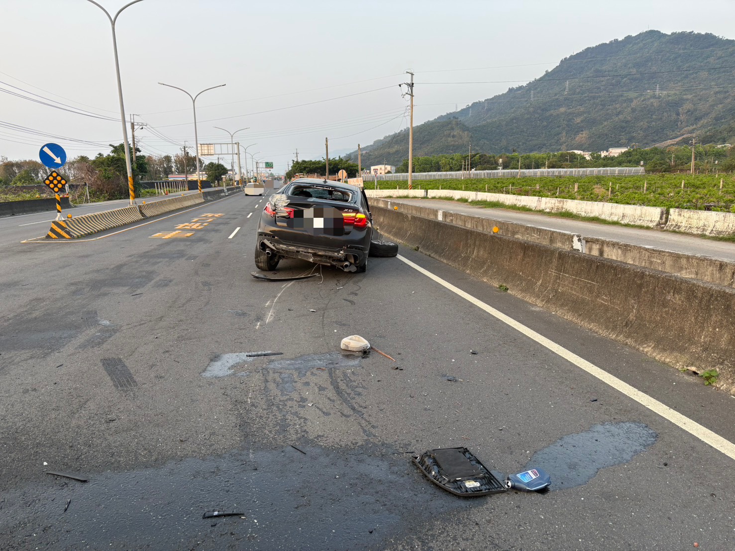 大武分局表示,今日凌晨4時34分許接獲報案,太麻里鄉台11線南下176.7K處發生交通事故,員警立即到場協助消防人員救護傷患。經暸解係張姓男子(33歲)駕駛休旅車因左側超車不順,追撞前方王姓女子(65歲)駕駛小貨車,強大撞擊力道造成貨車帆布棚架連同後車斗當場飛脫,BMW右前車頭也全毀車輪斷裂。張姓男子隨即棄車逃逸,王姓女子送往馬偕醫院診治,無生命危險。