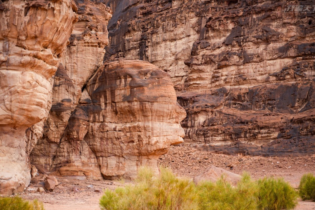 我們深入幽靜深邃的峽谷中漫步,拜訪充滿歷史傳奇色彩的「勞倫斯故居(Lawrence's House)」,聽Nayef講述那位「阿拉伯的勞倫斯」的精彩故事。之後來到附近崖邊的全景展望點,俯瞰整片壯闊大地時,真會有種暫離地球、置身火星的錯覺。這片赭紅色沙漠在陽光下閃耀著粗獷的美感,周圍每座如刀鋒般拔地而起的孤山,正訴說著歷經千萬年的地質故事。