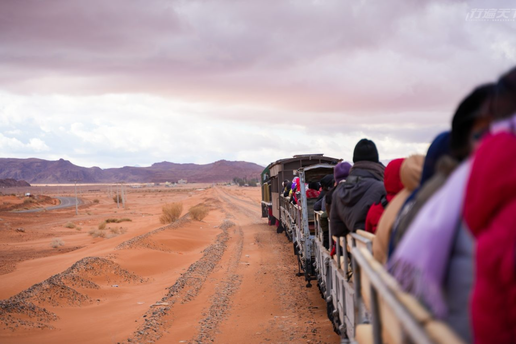 我們這群遊客坐上半露天柴油電力火車,扮演當年護送物資的鄂圖曼帝國一方,列車行駛在舊鐵道上,發出哐噹哐噹的節奏聲。儘管凜冽朔風陣陣襲來,遊客們的玩樂興致絲毫不減,拍照的、自拍的,一路上歡聲笑語。突然!一個響亮的爆炸聲打破寧靜,伴隨著四起的硝煙,代表約旦起義軍的阿拉伯士兵騎著駿馬,從鐵道旁的沙丘後方如狂風般衝殺出來,伏擊列車上的我們;而幸運被指派為「槍手」的車上遊客,也慌忙地趕緊扣下扳機反擊(當然,上膛子彈都是空包彈)。