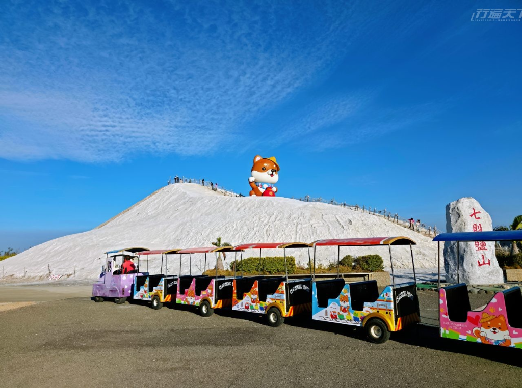 七股鹽田近年來以巨萌主題裝置藝術打造萌系地標,2026年主打可甜可鹽的6米「巨柴鹹 Dog Dog 展」讓遊客登頂鹽山同框打卡,因應梅雨季的安全考量,每年展出期從過年到4月春假,便同歷年來的人氣招財貓、鹽工、雪人等裝置藝術從6層樓高的鹽山移至景區平地區。今年推出全新寵物列車遊園,結合拍照裝置、戶外空間與輕鬆節奏,打造親子與寵物友善的療癒行程。七股鹽山幅員廣大,區內設有傳統曬鹽體驗區、扇形廣場、情人橋、青春廊道、良緣塘等景點。寓教於樂的趣味DIY活動像是手作鹽罐、彩繪系列、收鹽體驗都是大人小孩的最愛。