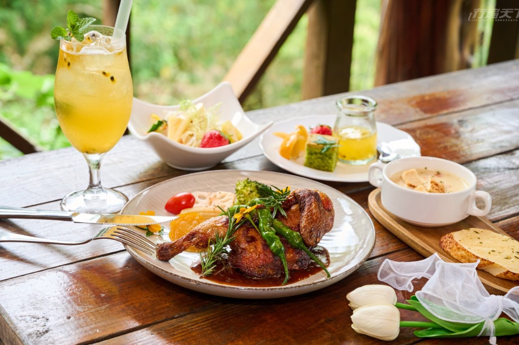 香草的魅力也延伸到餐桌,園區餐廳聘請專業主廚以自家種植的香草入菜,深受喜愛,人氣餐點「來安妮公主指名就是要吃 香草烤春雞」富含迷迭香的氣味;「蔬菜也是水果 蕃茄火鍋」鍋底以中式蔬菜高湯,加入主廚用香料熬製的西式紅醬,湯頭濃郁鮮美。