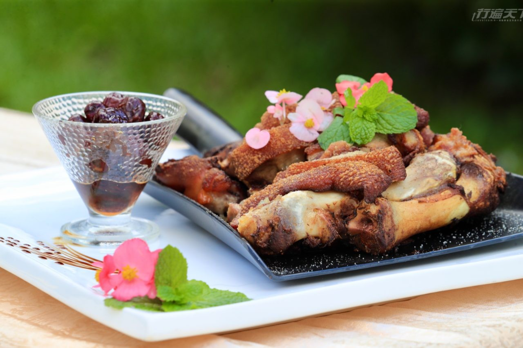 ▲ 台一農場的脆皮豬腳與四季海棠。