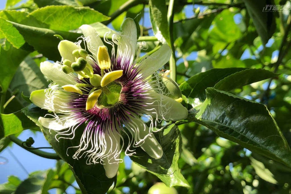 ▲ 百香果花模樣奇特,雌雄同株,一朵花上同時有3雌株與5雄株,像釘入耶穌身上的3根鐵釘,西班牙文Passioflos意指「受難之花」,傳到英語系被誤解成Passion fruit熱情果,日本人則覺得3雌株像時針、分針與秒針,因此稱「時計果」。