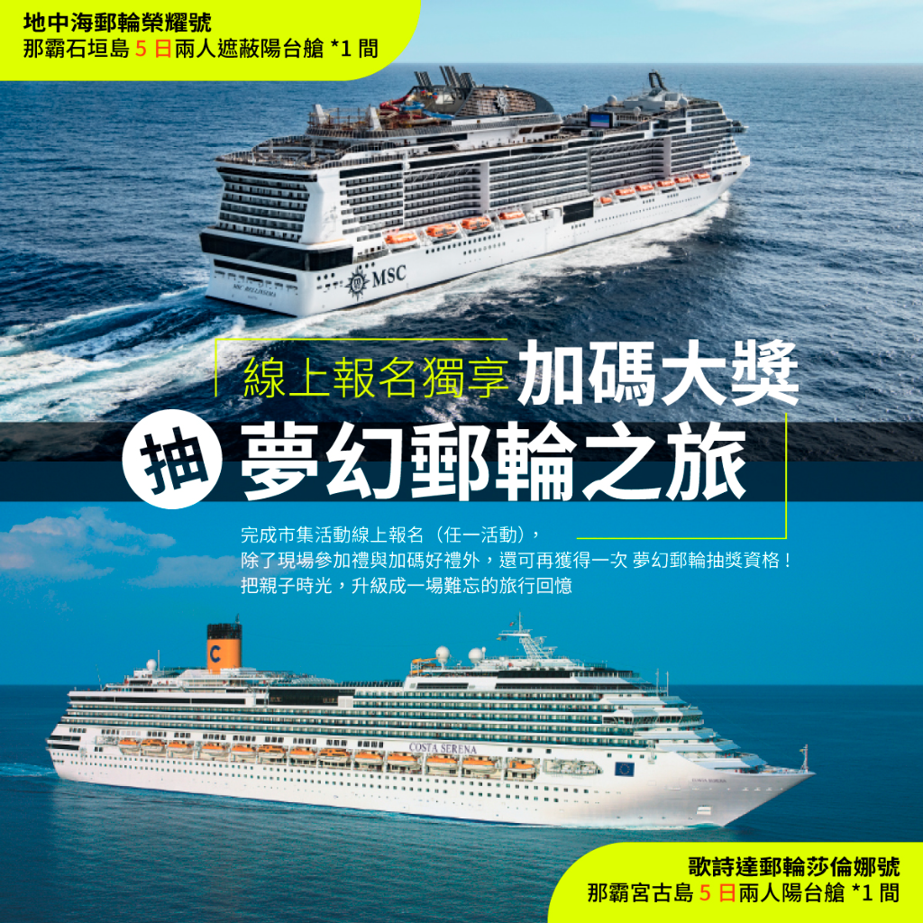 好想請假搭郵輪去日本玩哦!適合全齡層親子客最愛「郵輪之旅」掀起討論熱潮。本次活動祭出話題十足的壓軸抽獎——夢幻郵輪之旅,最大獎將送出地中海郵輪假期,包含 MSC地中海郵輪旗下榮耀號,以及 歌詩達郵輪莎倫號航程體驗,讓親子家庭有機會一圓出國夢。